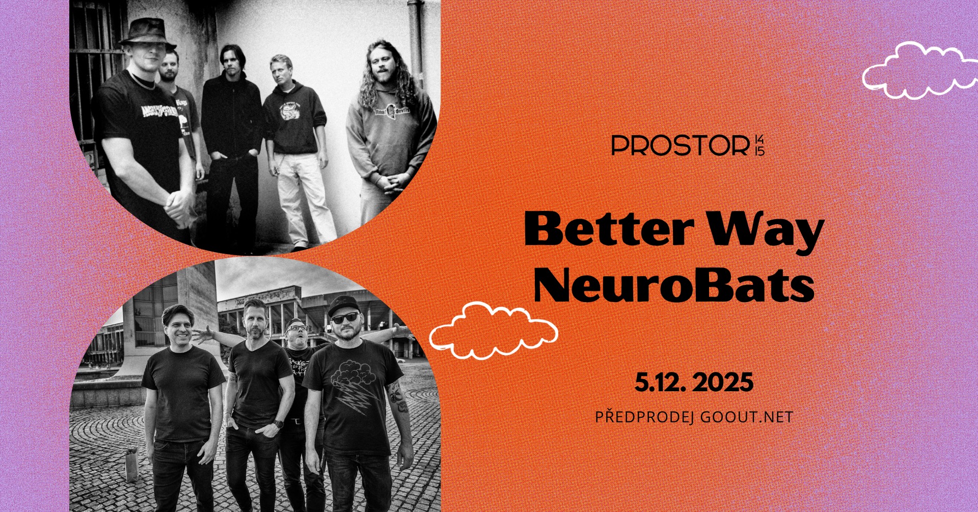 Neuro Bats je hardcorová kapela z Prahy, ve které se sešli bývalí členové Lvmen, Kevorkian, Eastern Star, Odd Boys, Stenmark, No Reason a The Unholy Preachers. V roce 2023 vydali pětiskladbové debutové EP pojmenované Noble Roses In The Midst Of Weeds. Letos v létě jim vyšlo CD Neuromantic Heavy Beats.Better Way je hardcore banda z Českých Budějovic hrající od roku 2008.Vstupenky jsou v předprodeji – sledujte událost pro víc info o prodeji na místě