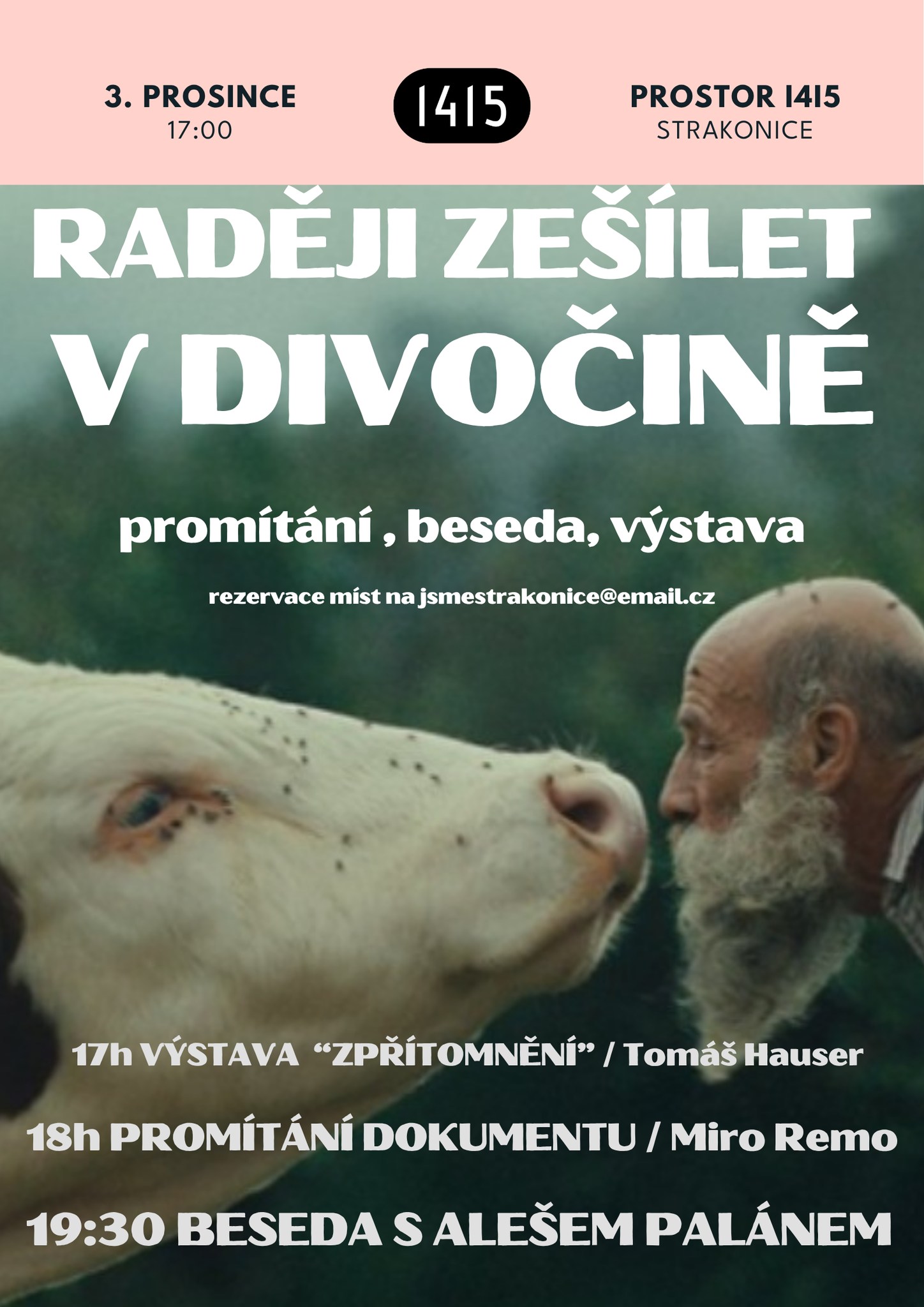 středa 3. 12. Komponovaný večer na téma Raději zešílet v divočině – film, beseda a výstava. Vstupné 150Kč pouze na místě v hotovosti (rezervace míst na jsmestrakonice@email.cz)17h vernisáž – Jednodenní výstava grafických listů – linorytů Tomáše Hausera, který vytvořil bibliofilii s texty básní Františka Klišíka nazvanou „Zpřítomnění aneb pocity Františka Klišíka, poety, jenž si pomalu zvyká, kterak jej osud žvýká, jak jej drtí ústa smrti do neuvěřitelné podoby stravitelné“18h promítání – dokument režiséra Mira Rema, Raději zešílet v divočině, volně rozvíjí motiv stejnojmenné knihy Aleše Palána a Jana Šíbíka o šumavských samotářích. Průvodci filmu jsou dvojčata František a Ondřej Klišíkovi – věčné děti žijící v magickém světě se svými domácími zvířaty. Společně sdílejí každý den, každou rutinu, každou myšlenku. Navenek působí jako zrcadla jeden druhého, uvnitř jsou však dvě naprosto odlišné duše. Roky neoddělitelného soužití jim začínají přerůstat přes hlavu. Franta sní o úniku, o létání, o světě za zdmi, které ho svazují. Ondra zůstává zakořeněný v tom, co dobře zná. Je vůbec možné uniknout, když celý svět nosí vaši vlastní tvář? Snímek si získal srdce diváků i poroty na festivalu v Karlových Varech, odkud si odnesl hlavní cenu. (Aerofilms)19:30 beseda s autorem knihy rozhovorů Raději zešílet v divočině, publicistou a spisovatelem Alešem Palánem. Ten je dvojnásobným držitelem ocenění Magnesia Litera (za knižní rozhovory se samotáři Jako v nebi, jenže jinak a sborník Brnox, který připravil s Kateřinou Šedou), dvakrát byl na tuto cenu také nominován (za rozhovor s bratry Florianovými Být dlužen za duši a román Ratajský les). Rozhovor se šumavskými samotáři Raději zešílet v divočině (PROSTOR 2018) se stal bestsellerem a zvítězil v anketě Kniha roku Lidových novin, rozhovor s bratry Reynkovými Kdo chodí tmami byl oceněn výroční cenou Českého literárního fondu. Třikrát Palánova kniha zvítězila v anketě Katolického týdeníku Dobrá kniha roku. Covidové problematice se Palán věnoval jako editor charitativního sborníku Za oknem a v knižním rozhovoru s Janem Konvalinkou Spánek rozumu plodí příšery. Pozornost vzbudily jeho eseje Rady pánu Bohu, jak vylepšit svět a Rady pánu Bohu, jak vylepšit svět ještě líp. Zatím poslední knihou Aleše Palána jsou knižní rozhovory se ženami, které si v životě vytáhly černého Petra, jež vyšly pod názvem Nevidím ani tmu (PROSTOR 2021).