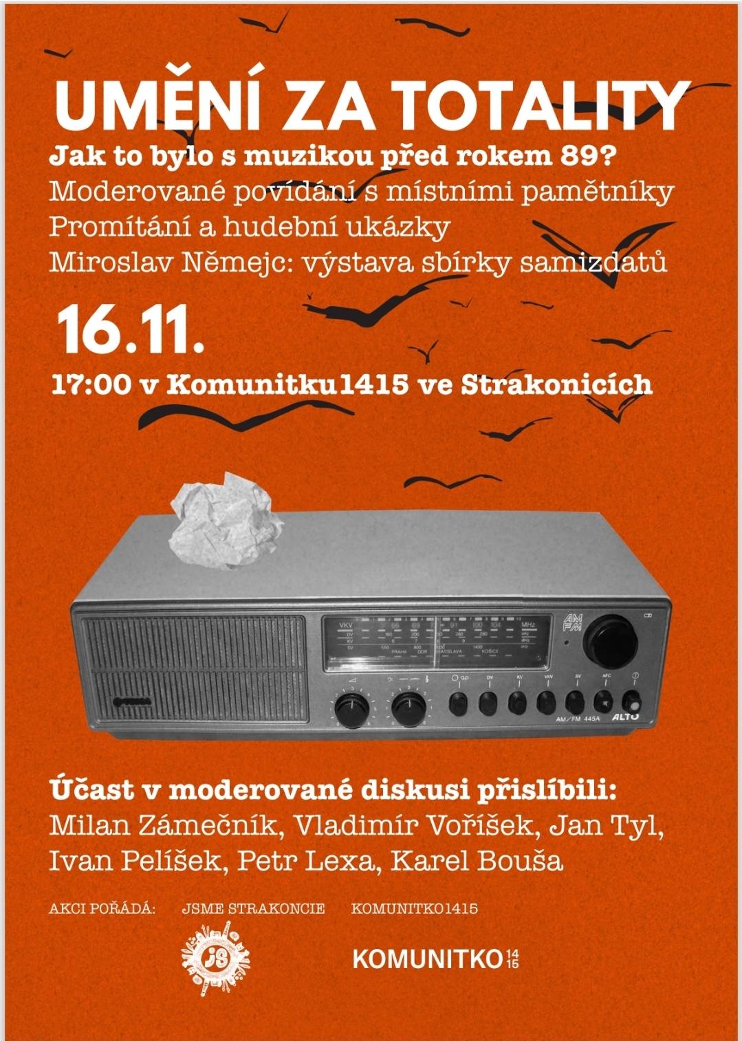 Beseda o tom, „jak se praktikovala hudba a umění před rokem 89“. Volné moderované povídání s hosty spjatými s našim městem, videoukázky a výstava soukromé sbírky samizdatů. Vstup zdarma. Komunitko 1415 (Na Ostrově 1415, 1.patro, vstup ze dvora).moderátor: Ladislav Řanda